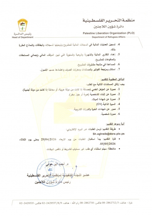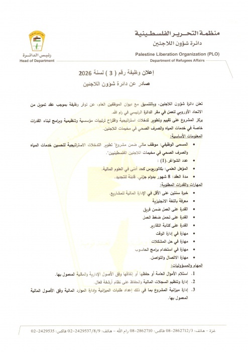 تعلن دائرة شؤون اللاجئين وبالتنسيق مع ديوان الموظفين العام عن توفر وظيفة (موظف مالي) بموجب عقد تمويل من الاتحاد الأوروبي للعمل في مقر الدائرة الرئيسي في رام الله.